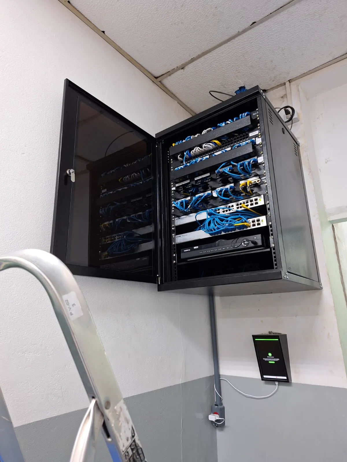 Todos os pontos de rede, cabos e conexões no rack são etiquetados e documentados em planta. Qualquer técnico identifica rapidamente qual ponto corresponde a qual sala.